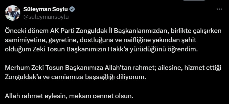 Tosun’un vefatı, siyasette birlikte görev yaptığı isimler başta olmak üzere birçok kişi tarafından üzüntüyle karşılandı. Eski İçişleri Bakanı Süleyman Soylu, sosyal medya üzerinden yaptığı açıklamada Tosun’a ilişkin duygularını paylaştı.