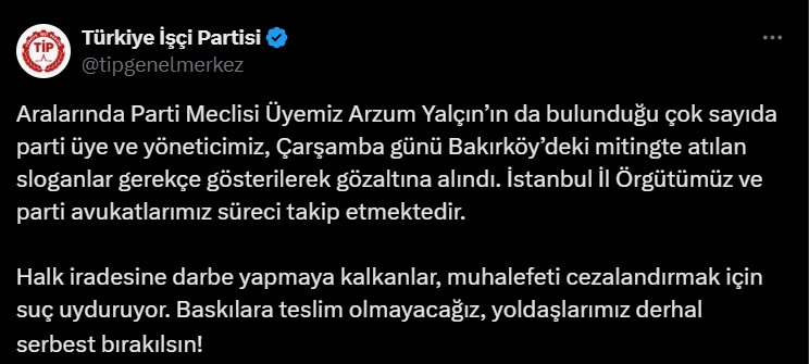 Türkiye İşçi Partisi tarafından yapılan açıklamada, miting sırasında atılan bazı sloganların gerekçe gösterilerek çok sayıda üye ve yöneticinin gözaltına alındığı duyuruldu. Parti açıklamasında, gözaltı listesinde Arzum Yalçın’ın da bulunduğu bilgisi paylaşıldı.