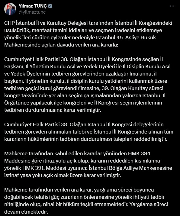 stanbul 45. Asliye Hukuk Mahkemesi, CHP’nin 38. Olağan İstanbul İl Kongresi’nde seçilen İl Başkanı Özgür Çelik ve beraberindeki yönetim kurulunun görevlerinden alınmasına karar verdi. Mahkeme ayrıca, geçici yönetim kurulunun atanmasına hükmetti.