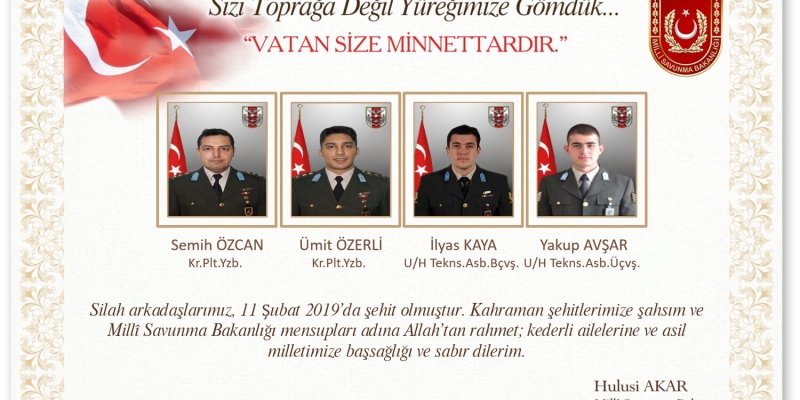 Milli Savunma Bakanı Hulusi Akar, İstanbul Çekmeköy'de askeri helikopterin düşmesi sonucu şehit olan askerlerimiz için; "İstanbul’da dört kahraman silah arkadaşımızın şehit olduğu helikopter kazasıyla ilgili inceleme için Millî Savunma Bakanlığı Teftiş Kurulu Başkanlığı görevlendirilmiştir" dedi.